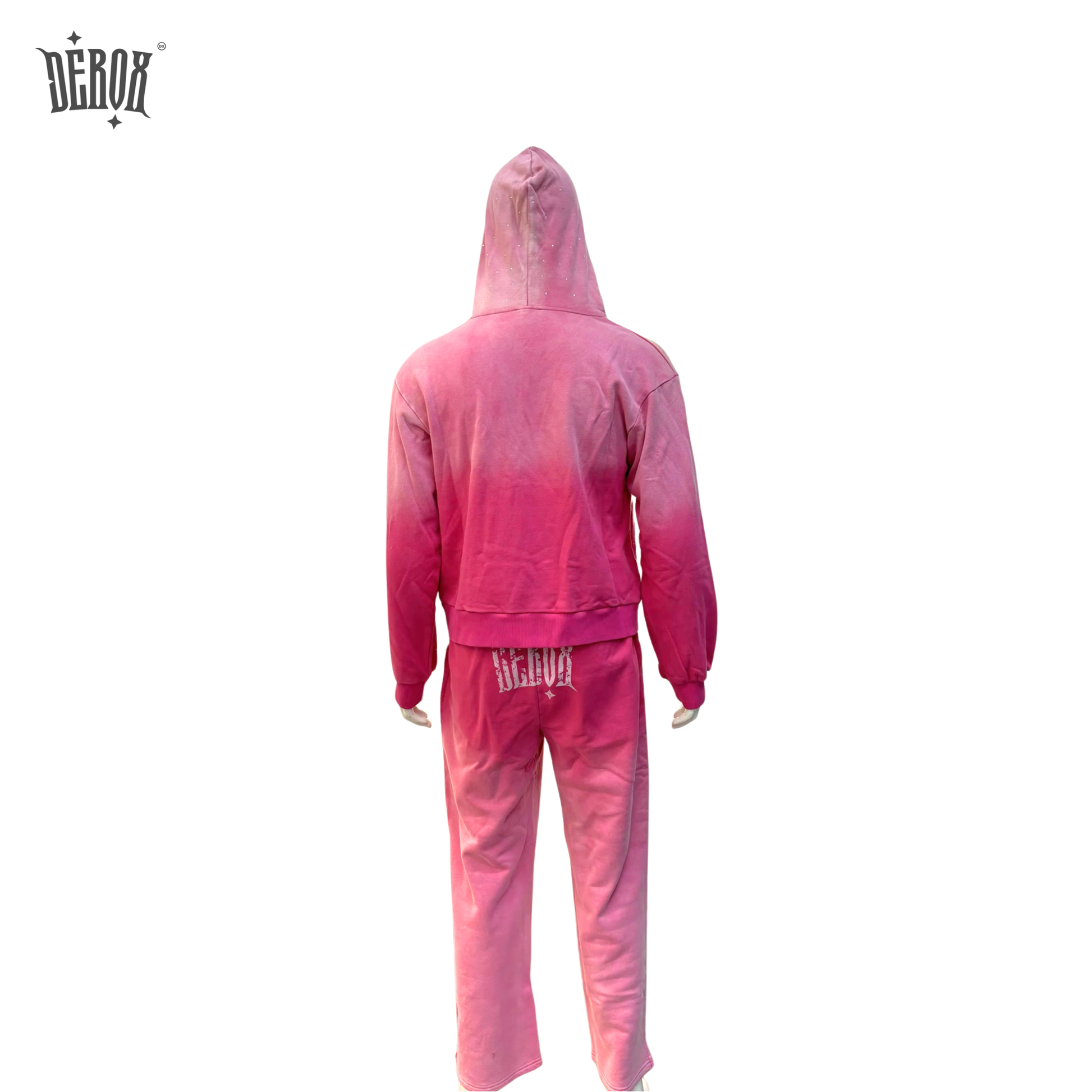 Morbidissimo al tatto. Effetto degradé rosa con finish washed. Centinaia di strass applicati a mano creano un pattern che si intensifica gradualmente, creando un effetto visivo che cattura l'attenzione su entrambi i capi.